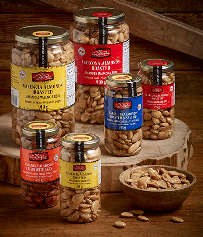 Marcona almonds are more rounded and plump than the California variety most of us are used to seeing. They also have a softer and somewhat moist texture, similar to macadamia nuts and have a sweeter, more delicate taste than regular almonds. The signature ingredient though, is a high quality Spanish salt that naturally coats the almonds due to their moist texture. The flavour combination is irresistible.